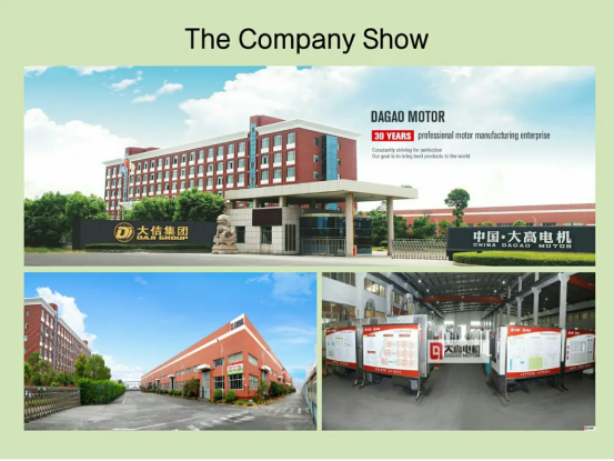 DAJI GROUP.ZHEJIANG DAGAO ELECTRIC MOTOR CO.,LTD, is professional enaged in electric motor manufacturing for 30 years sice 1988.The headquarters is located in Shanghai city ,group with 4manufacturing bases in Zhejiang and Shanghai ,has more than 300 national sales centers and special agencis , and exported to more than 50 countries and regions.